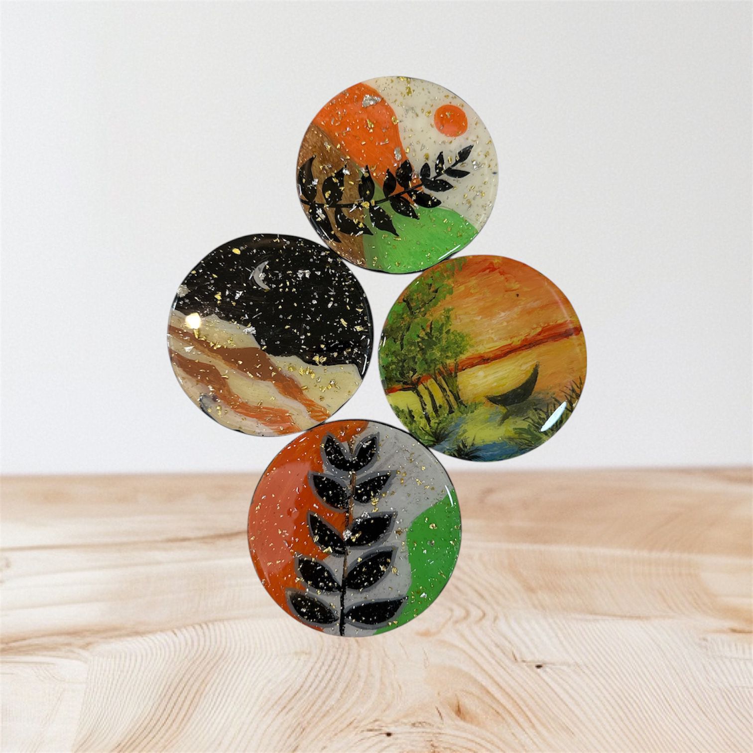 اربعة قطع من الخشب (قواعد الأكواب ) على شكل دائرة قطرها 10 سم مرسومة يدويا بأشكال الطبيعة ومطلية بمادة الريزن اللامع للحماية من بقع المشروبات الساخنة وحرارة الاكواب والخدوش