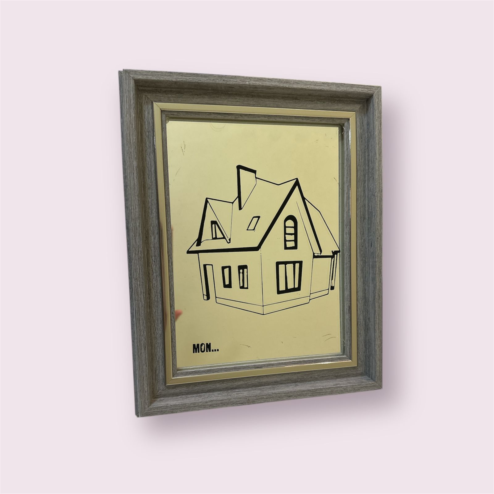 برواز صغير من الزجاج والمرابا محفور يدويا بتصميم مميز على شكل بيت  – مع اطار خشبي انيق  – قياس 20*25