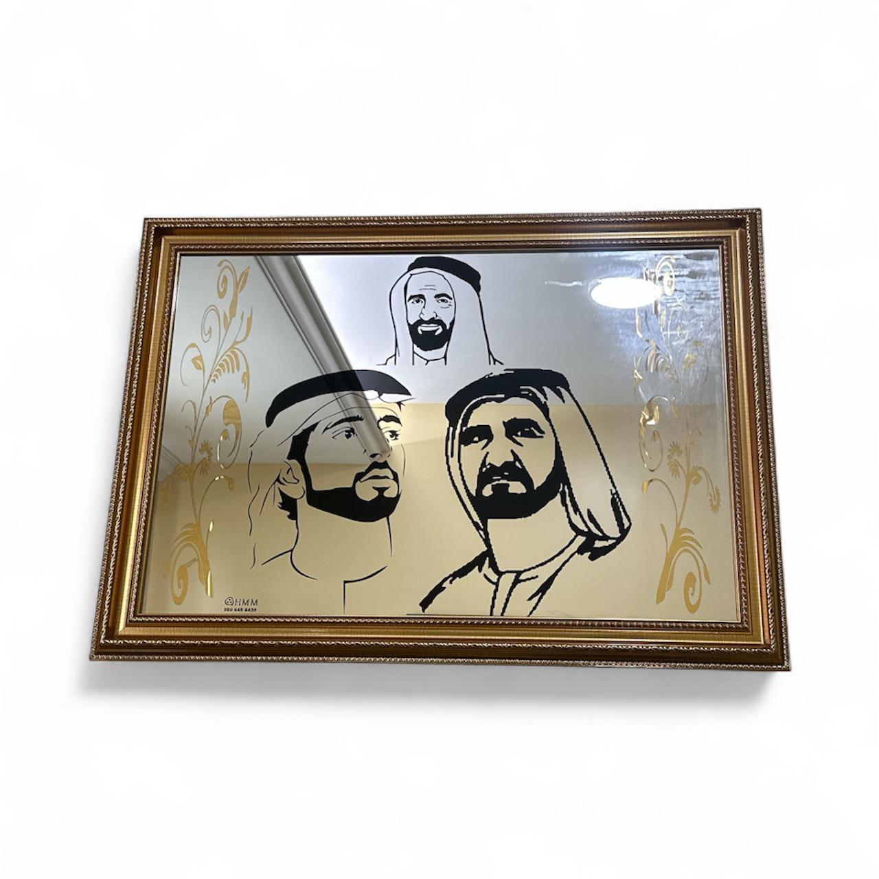 برواز كبير من الزجاج والمرايا محفور بصور الشيوخ ومحاط باطار خشبي أنيق باللون الذهبي – قياس – 110*100