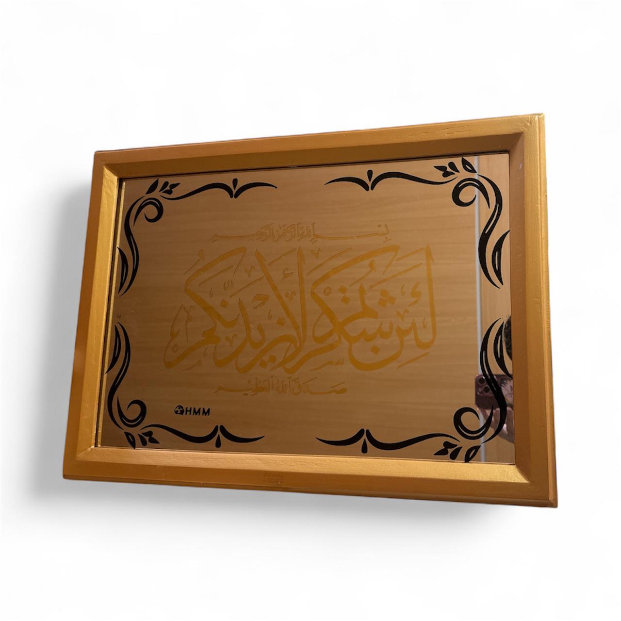 برواز من الزجاج والمرايا محفور بآية قرآنية (لئن شكرتم لأزيدنكم) – محاط باطار خشبي باللون الذهبي قياس 40* 35 مناسب للحائط