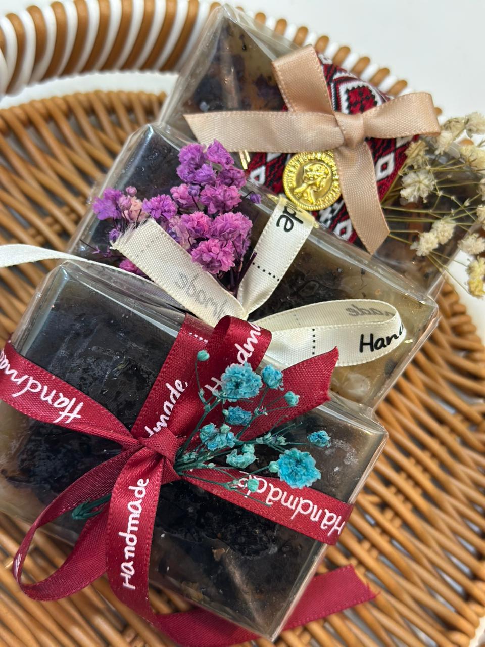 ثلاث قطع من صابون الجلسرين الطبيعي الشفاف خالي من المواد الكيميائية بالورد الطبيعي مغلف ومزين بالزهور