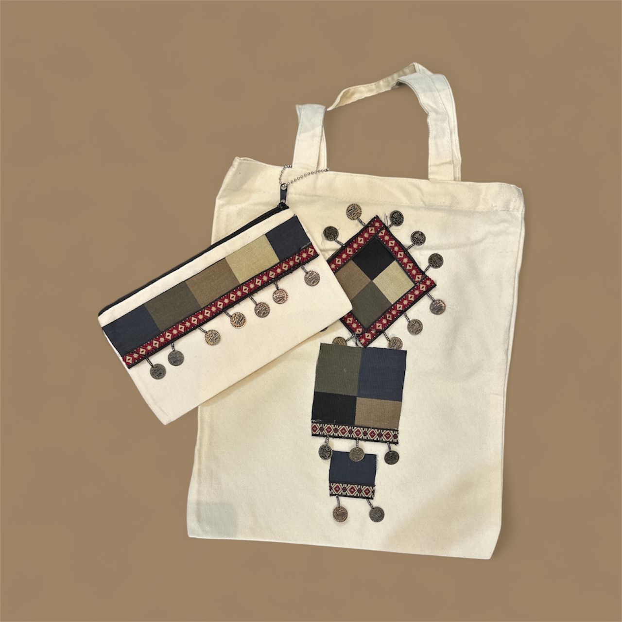حقيبة كتف من القطن المتين مع محفظة صغيرة من نفس الخامة مزينة يدويا بتصميم تقليدي يضيف لمسة من الجمال مناسبة للارتداء اليومي