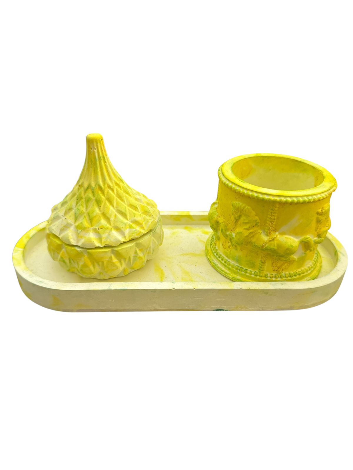 سيت كامل من الجبس الفاخر باللون الاصفر المموج يتكون من علبة صغيرة ذات غطاء انيق مناسبة للديكور