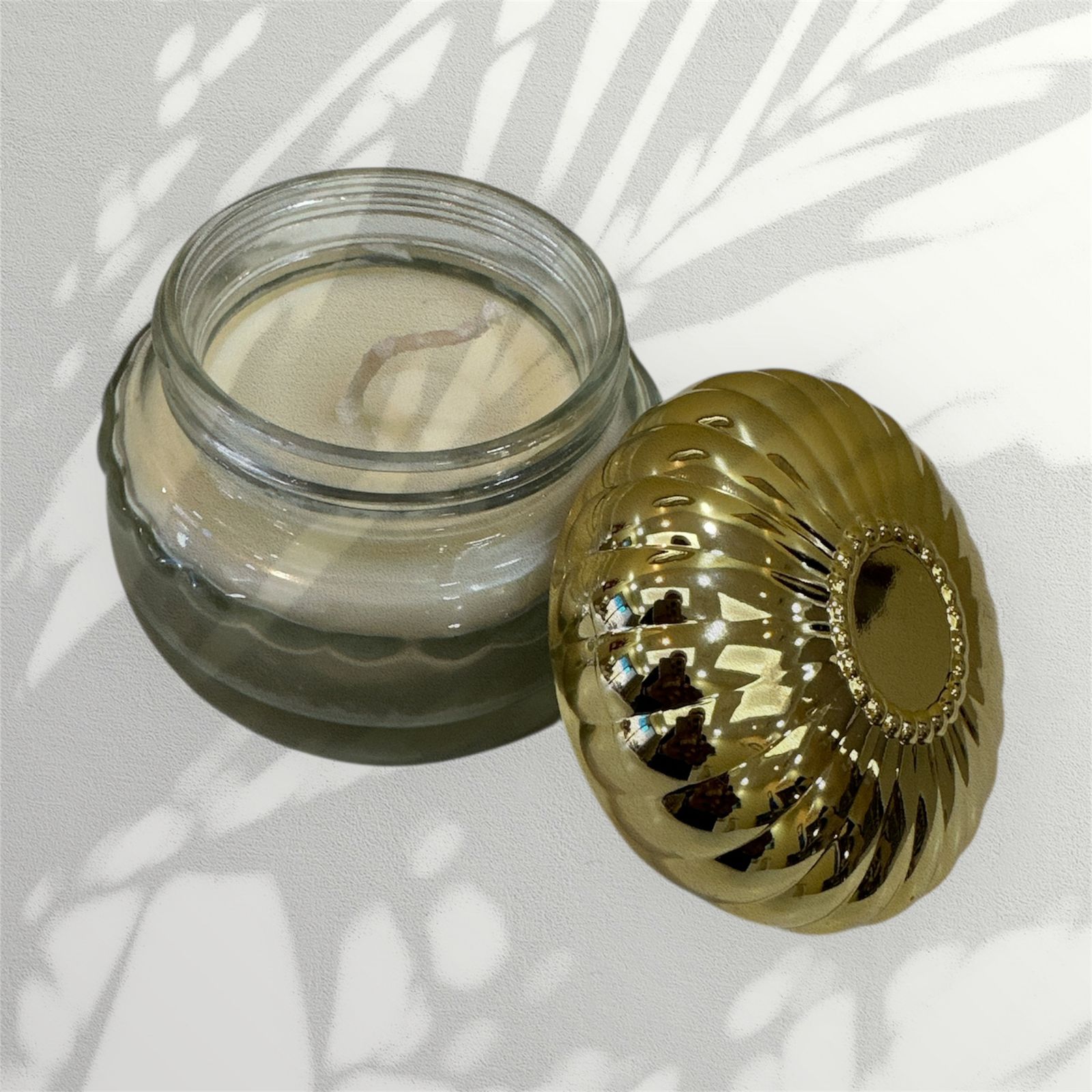 شمعة فاخرة باللون الابيض في علبة زجاجية انيقة معطرة برائحة الفانيلا تضيف لمسة عصرية جميلة تناسب أي ديكور