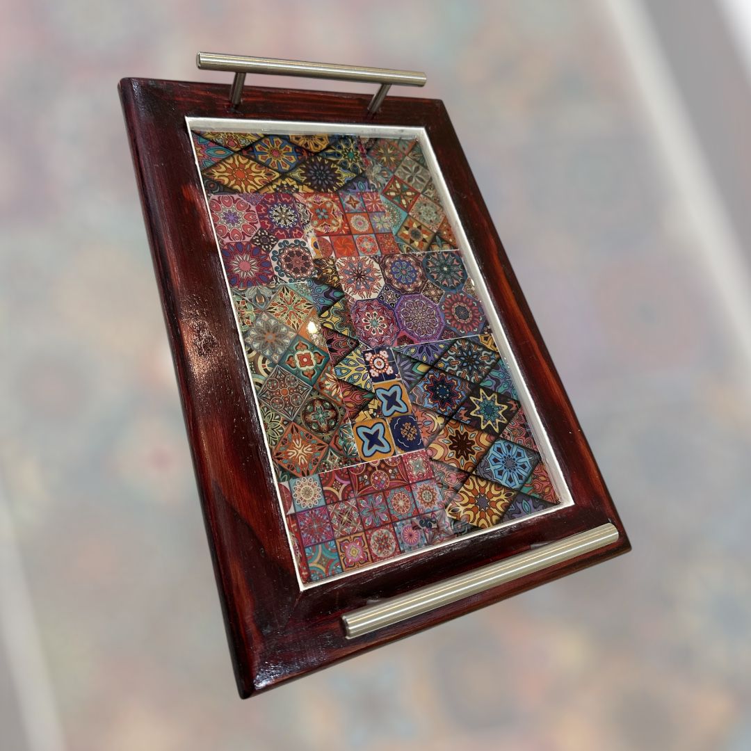 صينية ضيافة خشبية بأرضية من فن الديكوباج مطلية بمادة الريزن القوية  مقاس 20*40