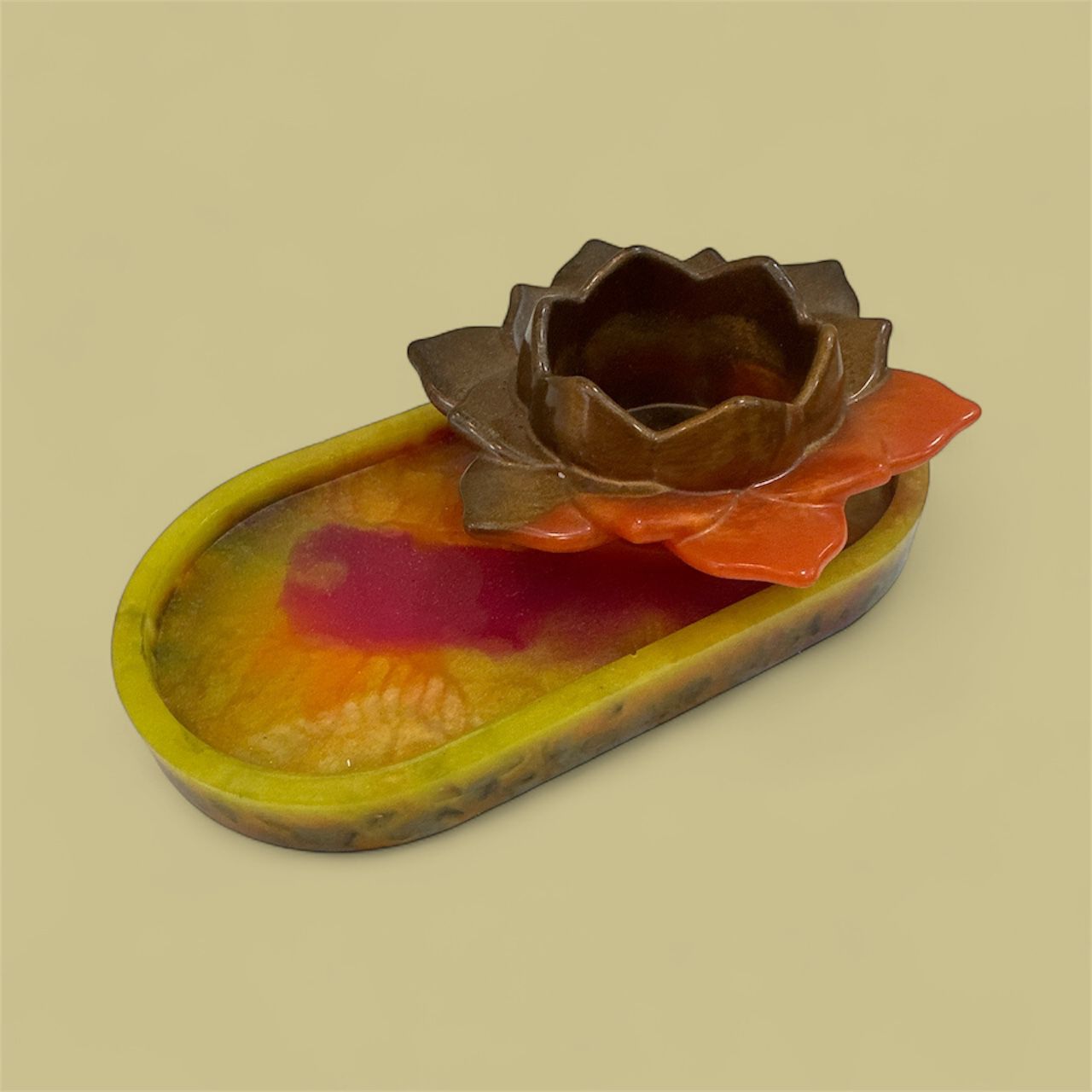 قاعدة من الريزن المتين مموجة بالالوان مع حامل للاكسسوارات على شكل وردة