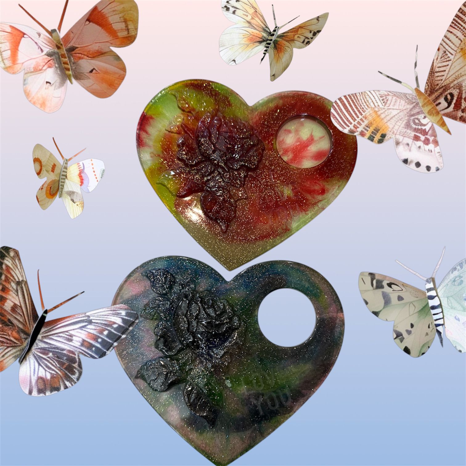 قطعتين فنية من الريزن على شكل قلب انيق تجمع بين الجمال والشفافية مموجة بألوان مختلفة مناسبة للهدايا