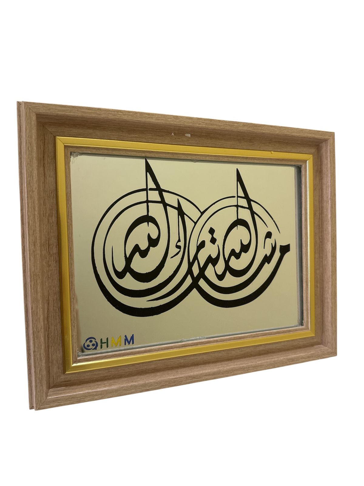 لوحة صغيرة من المرابا محفورة يدويا بعبارة (ما شاء الله ) بتصميم رائع باللون الاسود – مع اطار خشبي انيق  – قياس 20*25