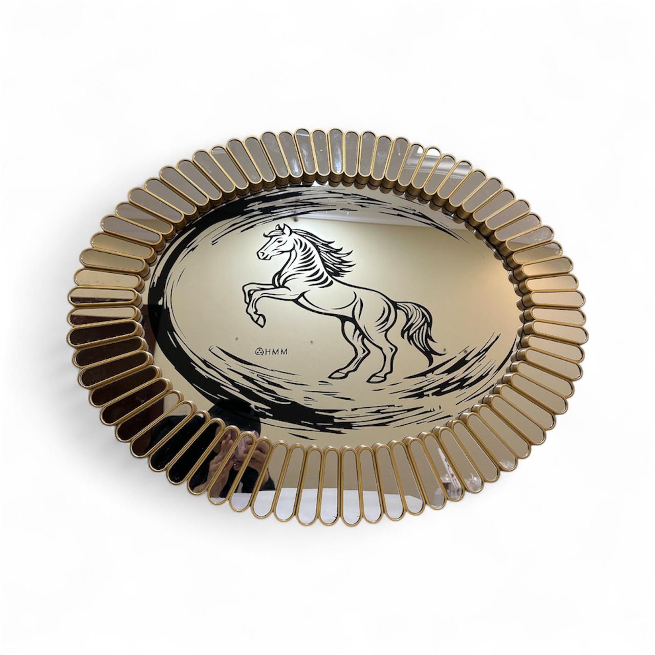 لوحة فنية من الزجاج والمرايا محفورة برسمة ( الخيل ) محاطة باطار باللون الذهبي اللامع قياس 40*35